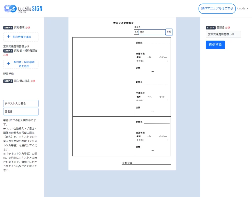 書類を作成からPDFをアップロードし、所定の相手先メールアドレスの設定、署名や印鑑等の要素の配置をドラッグアンドドロップで行ない送信することで電子契約書を任意の相手に送信・進行状況の確認・締結することが可能なシステム。