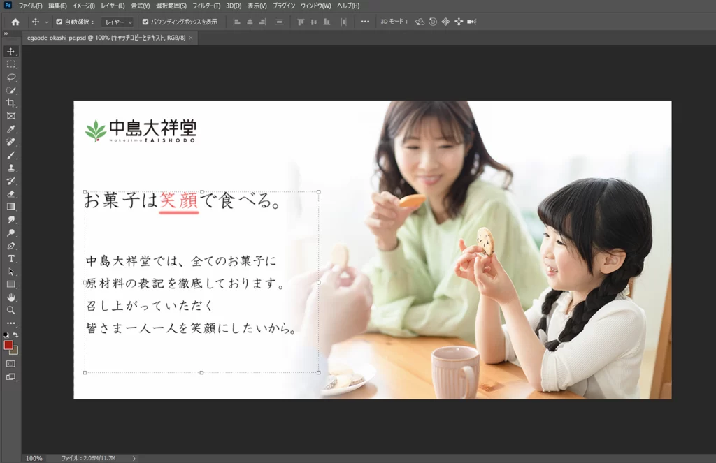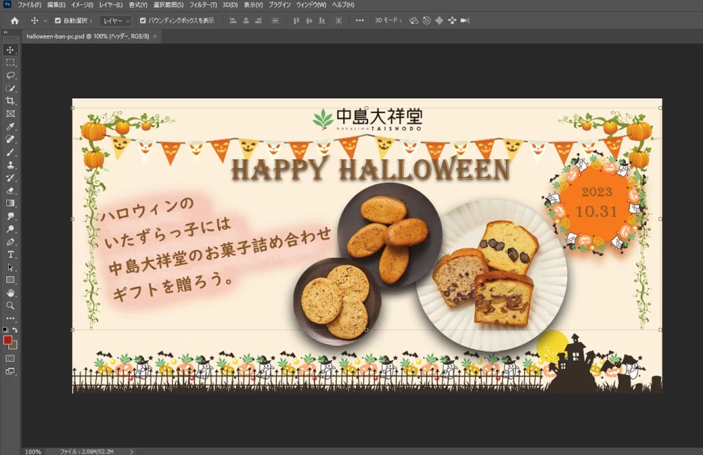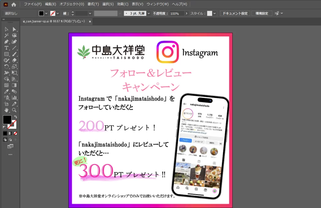 制作時間:約2週間 ※ほぼ企業研究と街に繰り出したり、インターネット上のデザインを参考に案を収集の時間。3つのバナー作成で半日程。