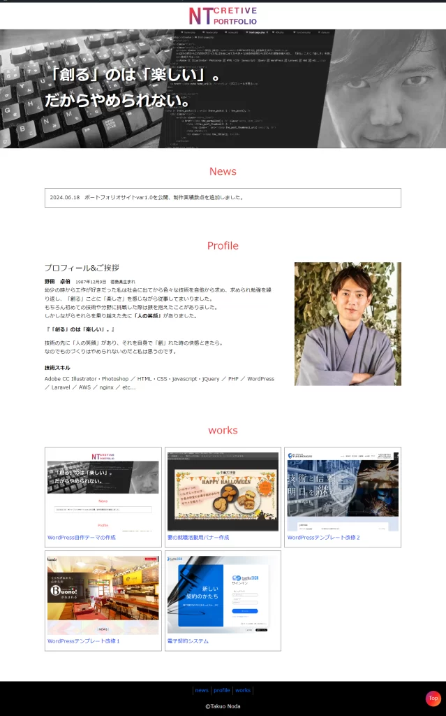 インターネット上に数多あるポートフォリオサイト用テーマを用いても良いと思ったが、それらテーマは綺麗かつ高機能であるが、不要な機能が多すぎる点とせっかく1からテーマを作れる機会なので自作することにした。少々時間を要したものの久しぶりに0から作る過程で新しい発見があり楽しかった。